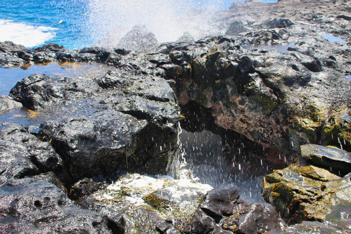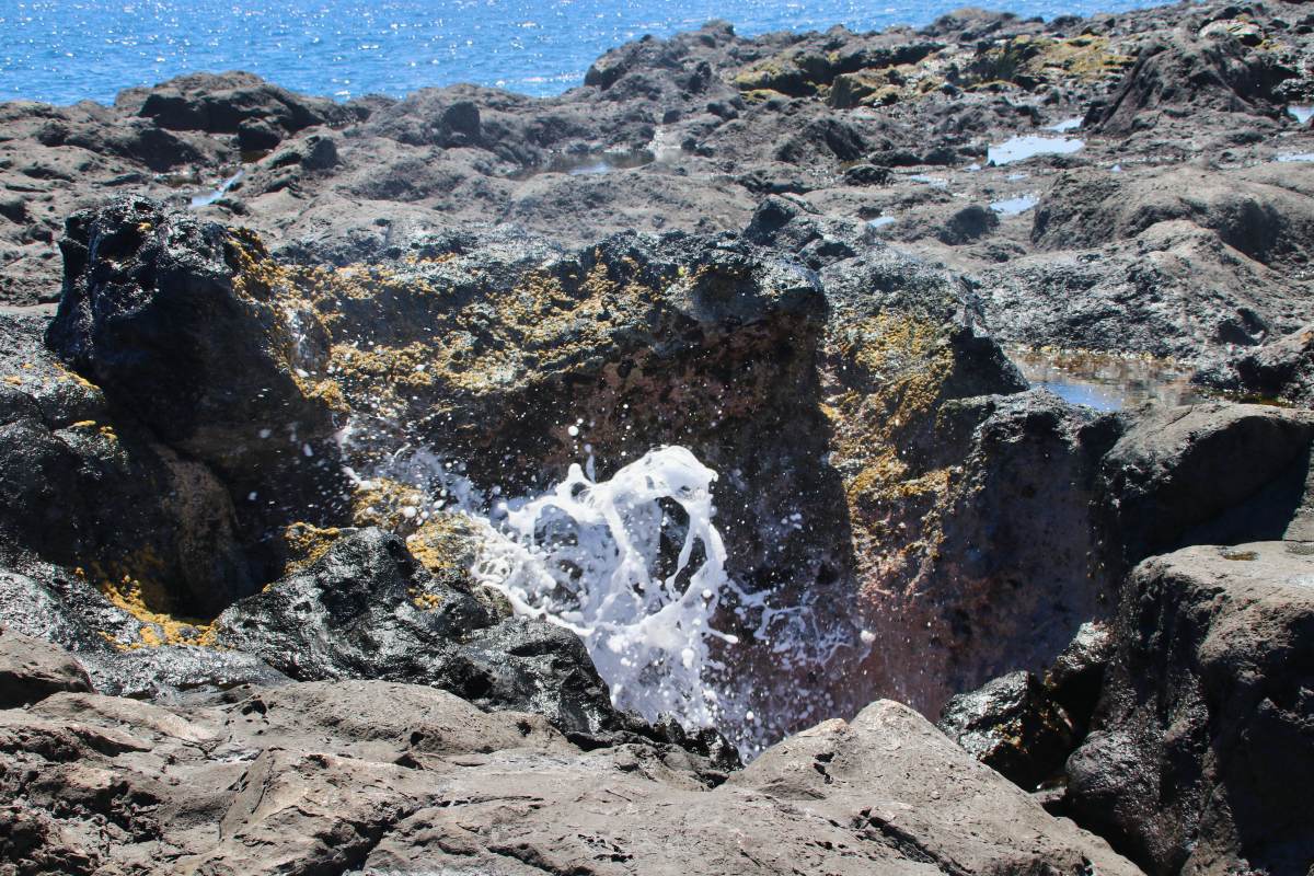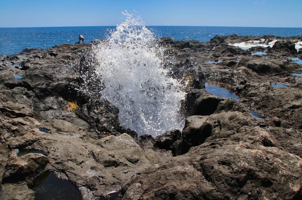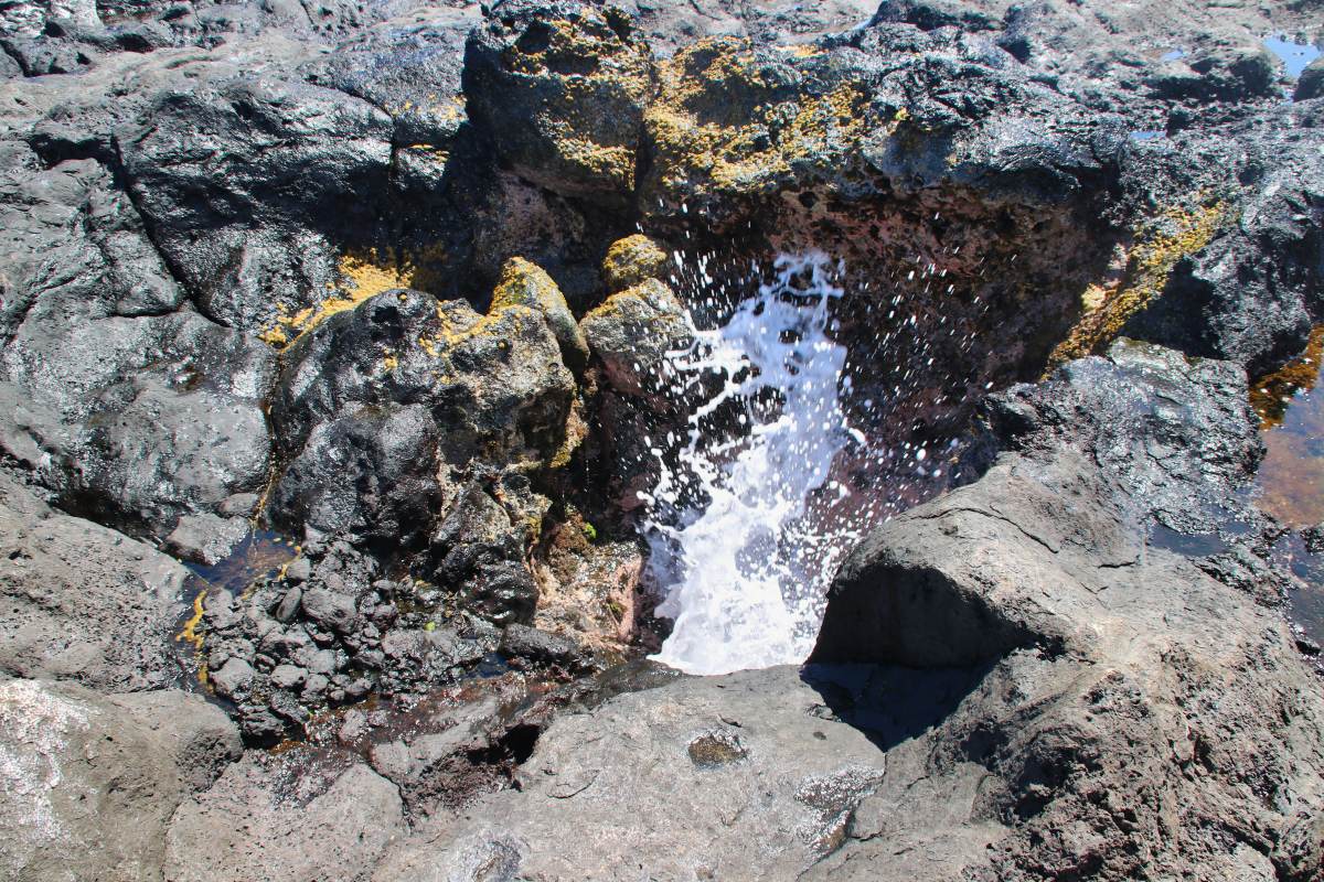 Auf dem Weg nach Cilaos machen wir noch einmal Halt am Meer. Neben den Salinen knallen die Wellen gegen die Felsen, und das Meerwasser spritzt durch verschiedene Löcher. Wir beobachten Fische, die direkt am Ufer nach Nahrung suchen.