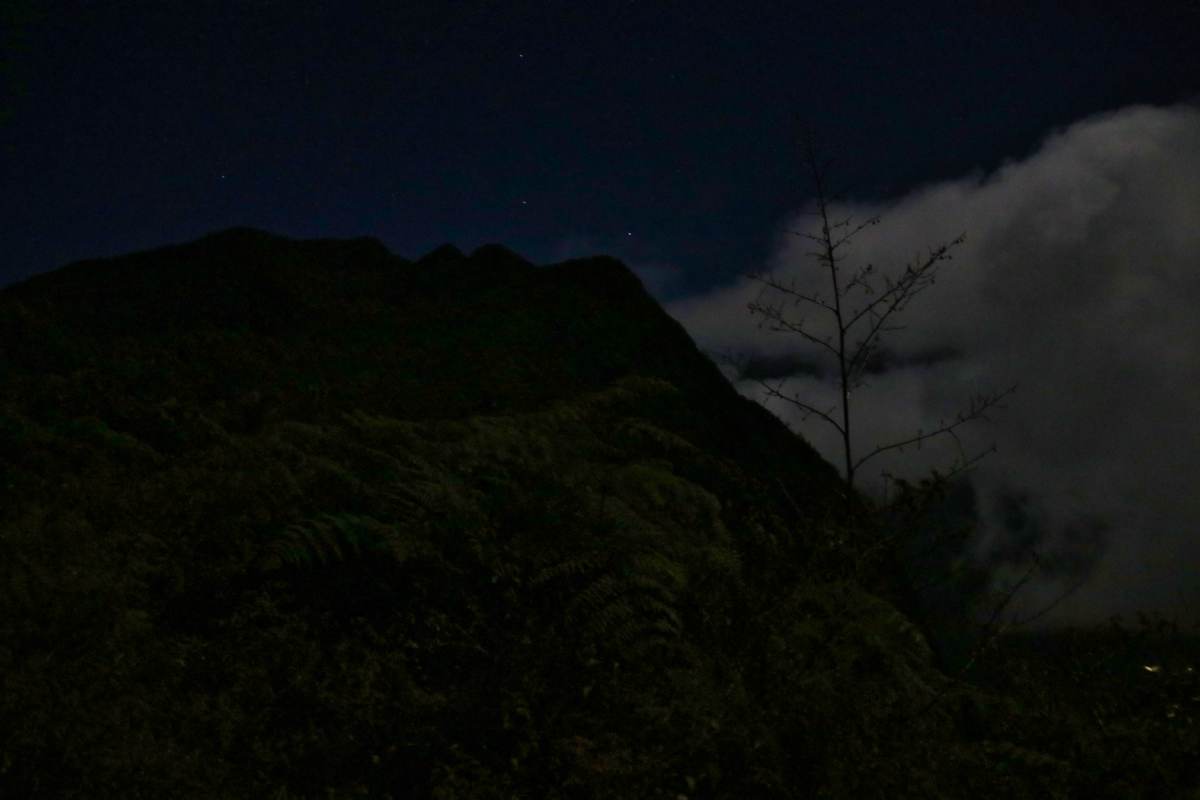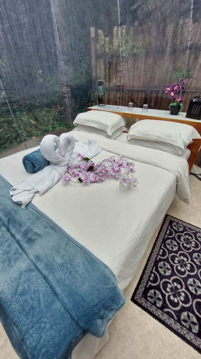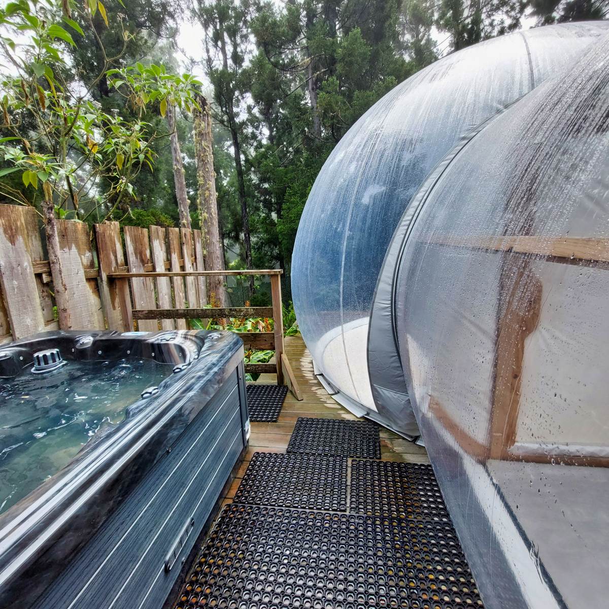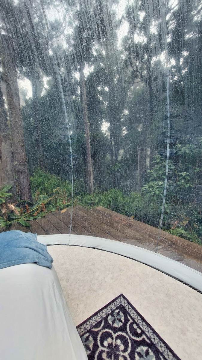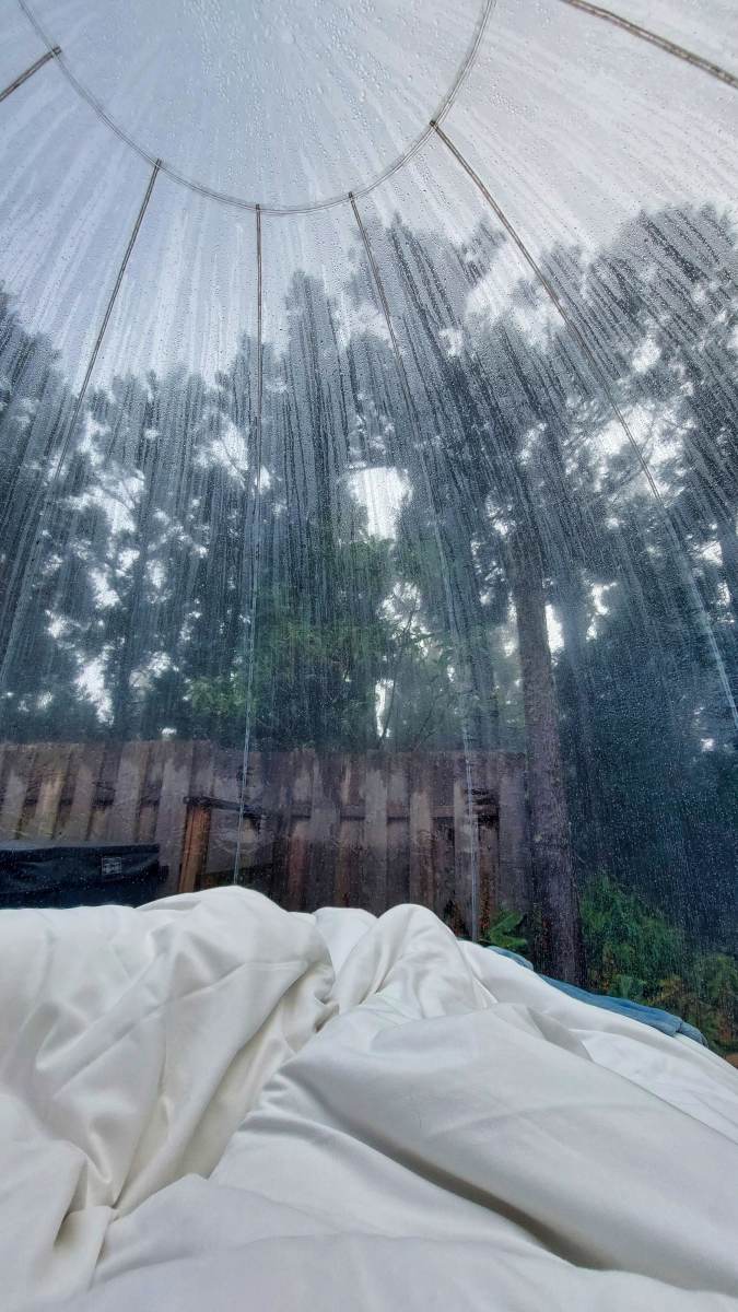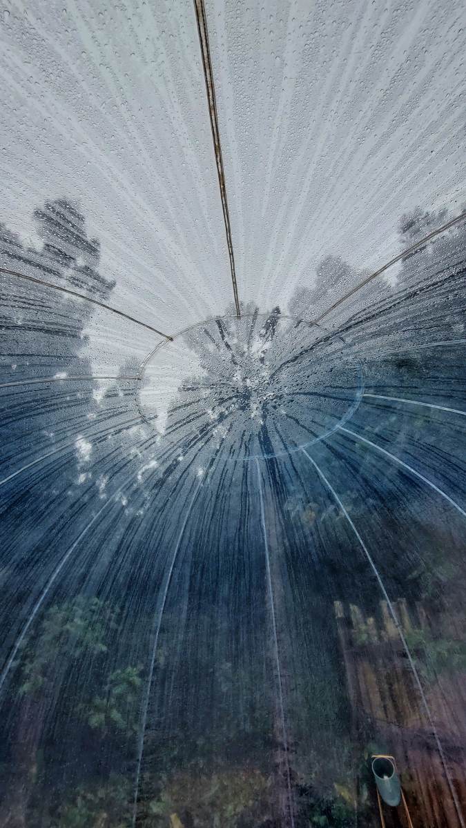 Leider ist es bewölkt, die Blase ist von Regentropfen bedeckt, und der Vollmond verhindert, dass wir viele Sterne sehen. Trotzdem ist es ein Erlebnis.