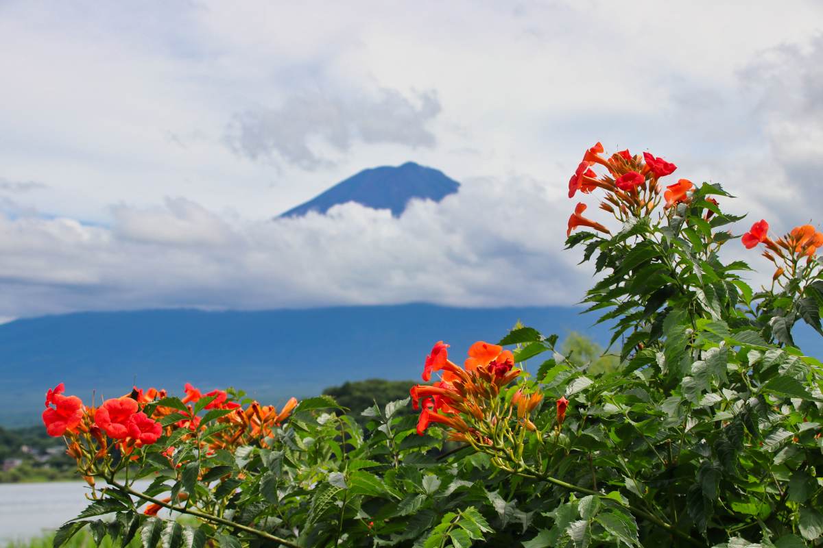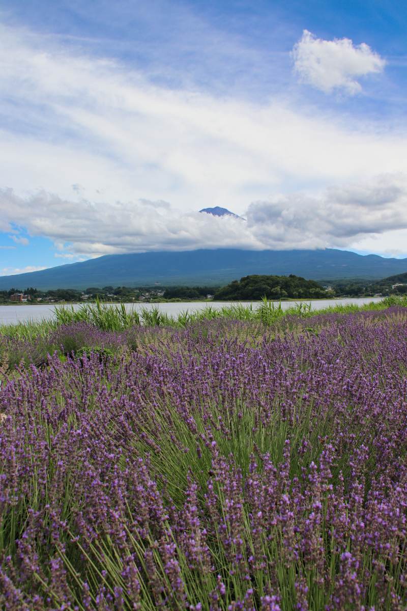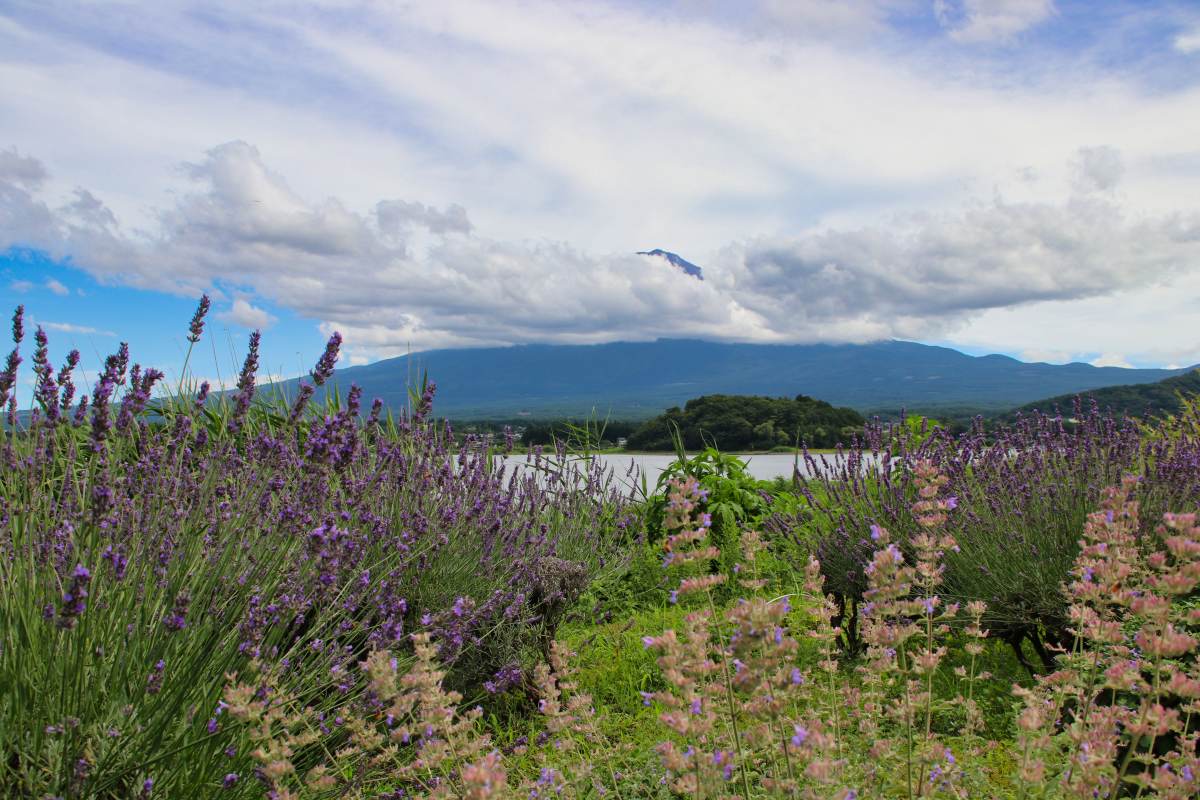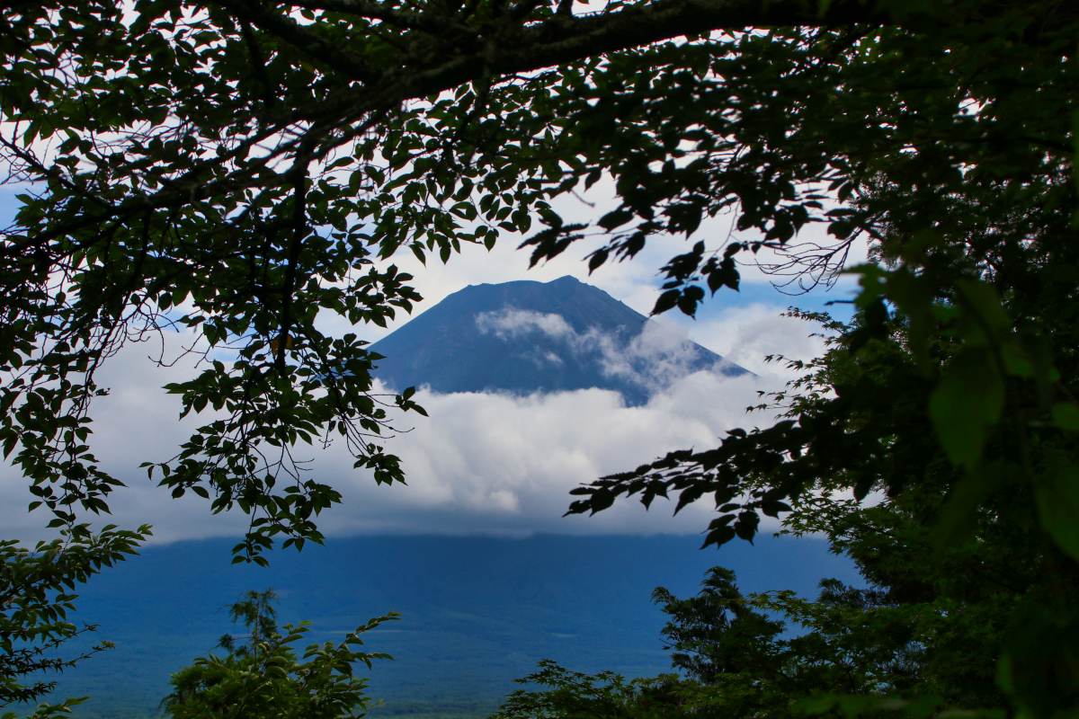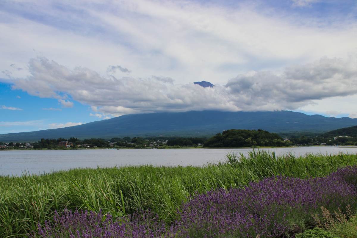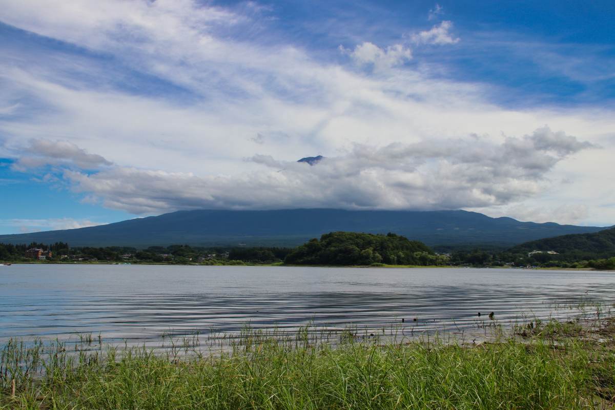 Der Park liegt am Kawaguchi-See. Von hier hat man eine tolle Aussicht auf den Berg, der sich gerade aus den Wolken befreit. Bei unserem vorherigen Stopp am Lawson-Supermarkt war er noch komplett in Wolken gehüllt.